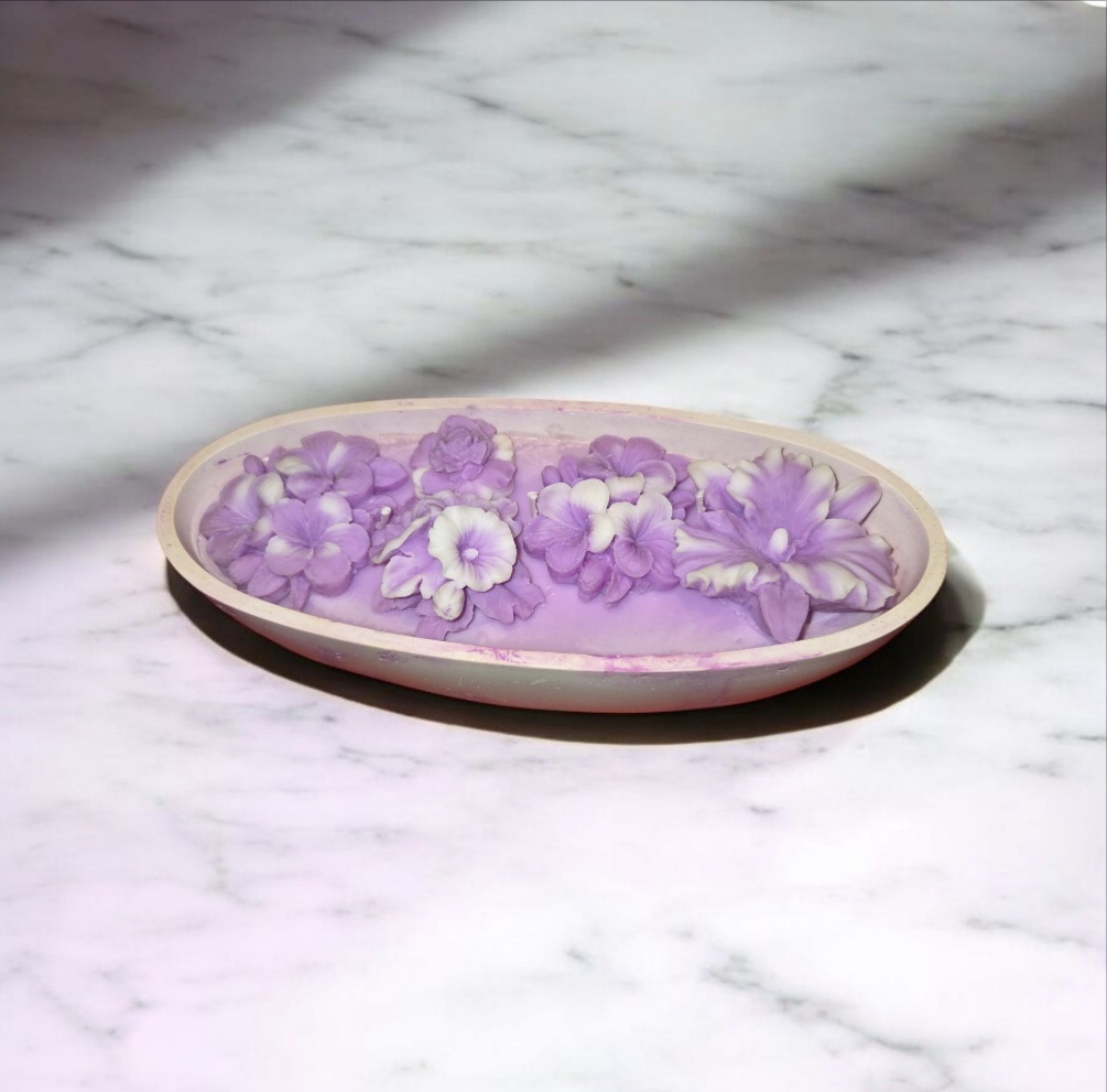 La Vela Jardín Lavanda en Bandeja es una pieza artesanal creada con cera natural, inspirada en la suavidad y la serenidad de los tonos lavanda. Su diseño presenta una delicada composición de flores esculpidas a mano, dispuestas sobre una base ovalada que realza su belleza y crea un efecto visual armonioso y lleno de calma.