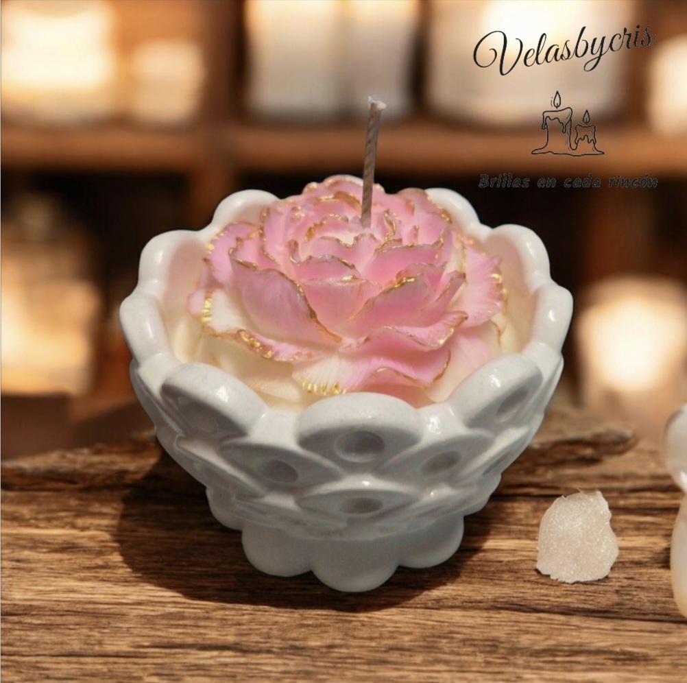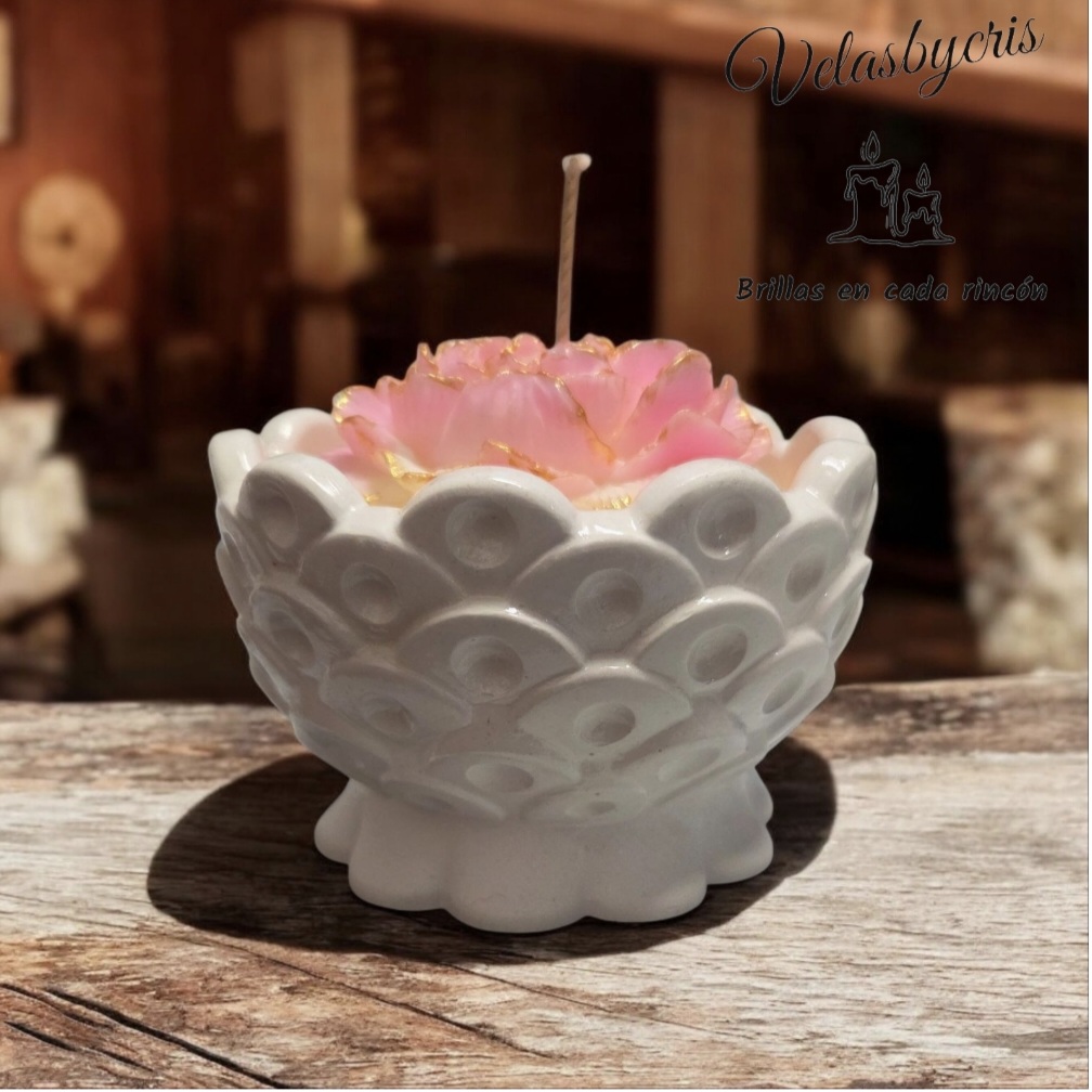 Cada detalle de la flor está cuidadosamente trabajado, resaltando su textura y forma para lograr un acabado realista y encantador. El contraste entre sus colores suaves y la base armónica de la vela crea una pieza decorativa que ilumina con sutileza y transforma cualquier ambiente en un rincón especial.