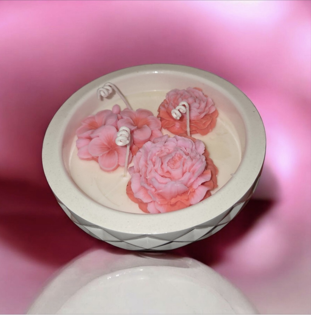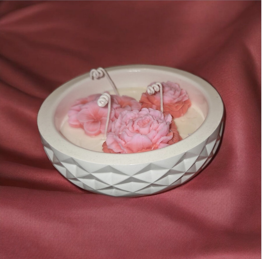 El contraste entre las flores y el cuenco blanco de textura geométrica aporta un toque moderno y refinado, convirtiendo esta vela en un elemento decorativo perfecto para cualquier ambiente. Su luz cálida y su estética floral hacen que sea ideal para dormitorios, salas, rincones especiales o como regalo significativo.