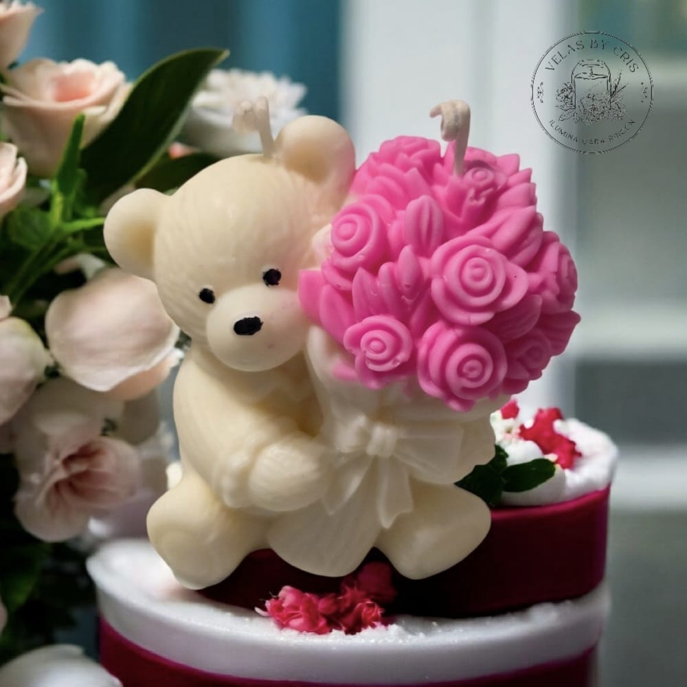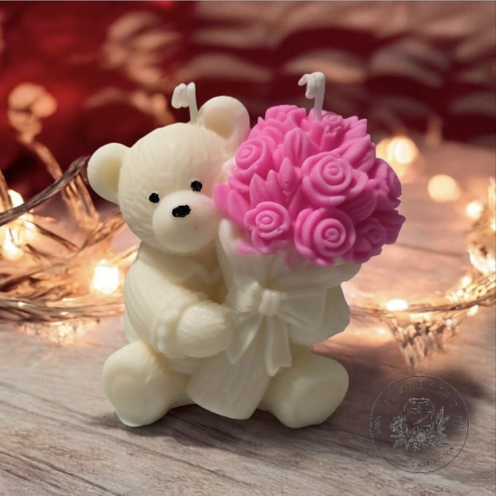 Vela artesanal “Osito con ramo de rosas